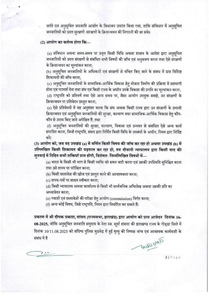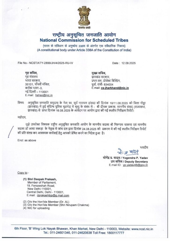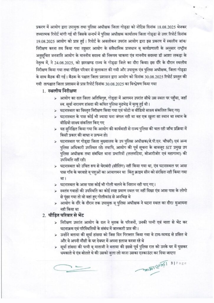 जब सूर्या हांसदा ने पहले ही पुलिस को बताया था कि उसने उस जगह पर खतरनाक हथियार छिपा रखे हैं और उसके 10-15 साथी भी वहां मौजूद हैं। राष्ट्रीय अनुसूचित जनजाति आयोग ने अपनी रिपोर्ट में उठाई है। जिसके बाद सूर्या हांसदा एनकाउंटर केस अब एक नई करवट लेता दिखाई दे रहा है। दरअसल राज्यसभा सांसद दीपक प्रकाश के शिकायत के बाद आशा लकड़ा के नेतृत्व में राष्ट्रीय अनुसूचित जनजाति आयोग ने सूर्या हांसदा मामले को संज्ञान में लेकर अपनी तहकीकात शुरू की।