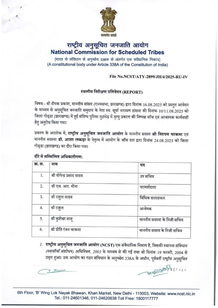 सूर्या हांसदा की एनकाउंटर में राष्ट्रीय अनुसूचित जनजाति आयोग( NCST)की ओर से जो जांच रिपोर्ट में क्या कहा है?