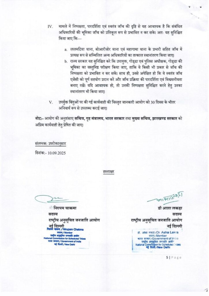 आयोग ने कहा कि यह बात पूरे घटनाक्रम पर संदेह पैदा करती है। इस पर गोडा एसपी ने जवाब दिया कि कितने पुलिसकर्मियों को भेजना है यह पूरी तरह एसपी के विवेक पर निर्भर करता है। और तो और इस मामले में एक बड़ी ही इंटरेस्टिंग बात सामने आई है। जिससे गोड्डा पुलिस बुरी तरह फंस सकती है। एसपी ने 19 अगस्त को इंस्पेक्टर जनरल मानवाधिकार झारखंड को जो रिपोर्ट भेजी उसमें मुठभेड़ की अवधि सिर्फ आधे घंटे बताई गई है। 11 अगस्त को राष्ट्रीय मानवाधिकार आयोग के सहायक निबंधक को भेजी गई रिपोर्ट में एसपी ने मुठभेड़ की अवधि को एक घंटा बताया था जो कि कानून के मायने में बहुत बड़ा अंतर है और यह किसी बड़ी साजिश या गड़बड़ी की तरफ इशारा हो सकता है। राष्ट्रीय अनुसूचित जनजाति आयोग ने अब निष्पक्ष जांच के लिए सीबीआई जांच की अनुशंसा की है। आयोग की ओर से कहा गया है कि गोड्डा जिले के डीसी, एसपी और डीजीपी की रिपोर्ट और राष्ट्रीय अनुसूचित जनजाति आयोग की ओर से की गई जांच के आधार पर कई बिंदुओं पर तथ्यात्मक दृष्टिकोण से भिन्नता पाई गई है। इसलिए सीबीआई से इस मामले की निष्पक्ष जांच कराई जाए। गोड्डा डीसी, एसपी और मुठभेड़ में शामिल पुलिस पदाधिकारी जांच प्रक्रिया में सहयोग करें ताकि इस मामले की निष्पक्ष जांच हो सके और दोषियों पर कानून सम्मत कारवाई हो सके। आयोग की ओर से यह भी कहा गया है कि राज्य सरकार यह सुनिश्चित करें कि प्रकरण से संबंधित सभी साक्ष्य सुरक्षित और संरक्षित रहे। उनके साथ किसी प्रकार का कोई छेड़छाड़ ना हो।