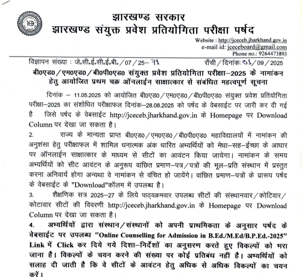 झारखण्ड राज्य के मान्यता प्राप्त B.Ed/M.Ed/B.P.Ed महाविद्यालयों में नामांकन की अनुशंसा हेतु परीक्षा फल में शामिल धनात्मक अंक धारित अभ्यर्थियों को मेघा सह इच्छा के आधार पर ऑनलाइन साक्षात्कार के माध्यम से सीटों का आवंटन किया जाएगा। नामांकन के समय अभ्यर्थियों को सीट आवंटन के अनुरूप वांछित प्रमाण पत्र पत्रों की मूल प्रति संस्थान में प्रस्तुत करना अनिवार्य होगा। अन्यथा वे नामांकन से वंचित रह जाएंगे।